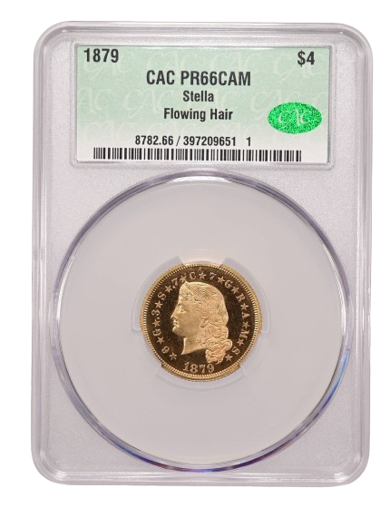 On May 9, Heritage auctioned a CACG certified Proof-66-Cameo 1879 $4 pattern in gold for $324,000. On May 3, Heritage sold an NGC certified Proof-66-Cameo 1879 $4 pattern in gold, without a CAC sticker, for $216,000.