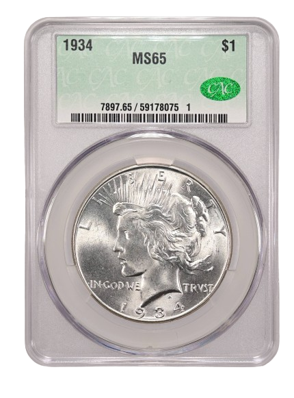 On May 12, GreatCollections sold a CACG graded MS-66 1934 Peace silver dollar for $4,675. On May 5, GreatCollections sold a PCGS graded MS-66 1934 Peace dollar, without a CAC sticker, for $3,025.