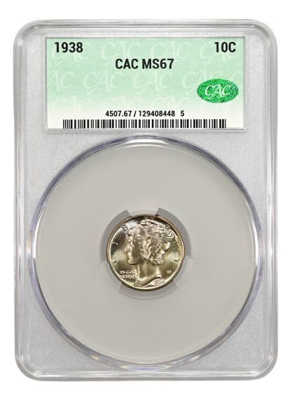 On Sept. 8, GreatCollections sold a CACG graded MS-67 1938 Mercury dime for $396. On Sept. 3, Heritage auctioned an NGC graded MS-68 1938 dime, without a CAC sticker, for $350. On Feb. 20, Heritage sold a PCGS graded MS-67 1938 dime, without a CAC sticker, for $89.